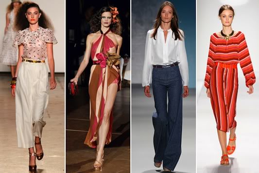 back this time with a vengeance. Billowy blouses, flared jeans, halter-neck